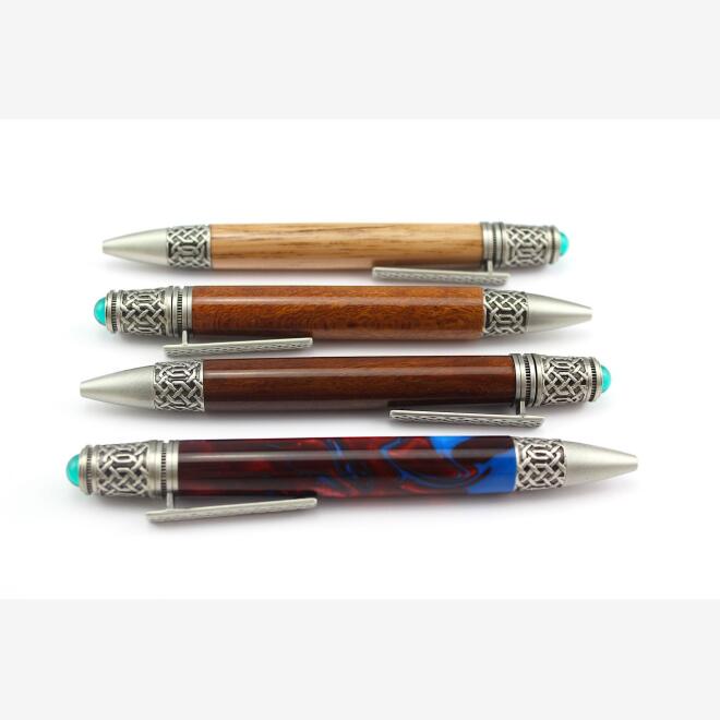 The Celtic pen features intricate celtic knot scrollwork on the tip, clip and end and a deep green emerald coloured cabochon that flashes in the light. The authentic patinas and natural darkening of the metals brings out the celtic knot details beautifully.