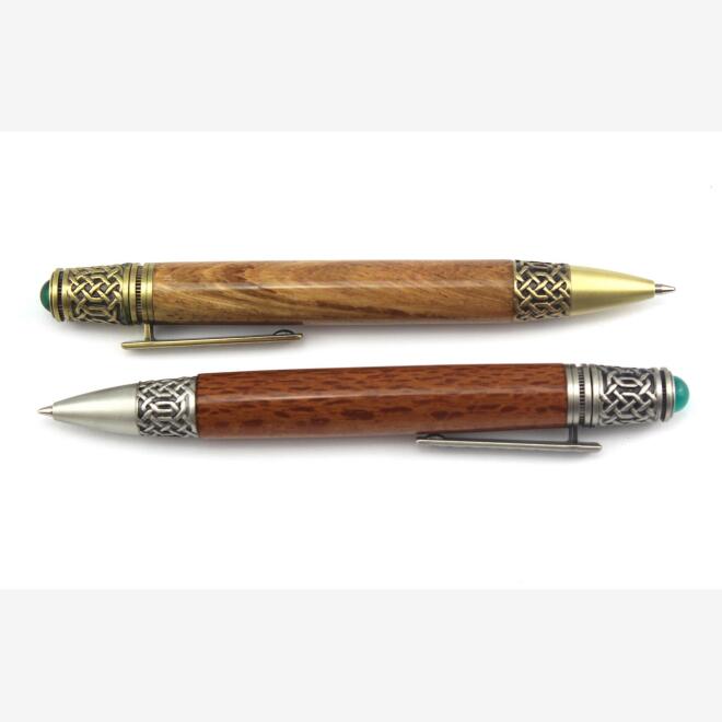 The Celtic pen features intricate celtic knot scrollwork on the tip, clip and end and a deep green emerald coloured cabochon that flashes in the light. The authentic patinas and natural darkening of the metals brings out the celtic knot details beautifully.