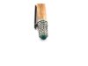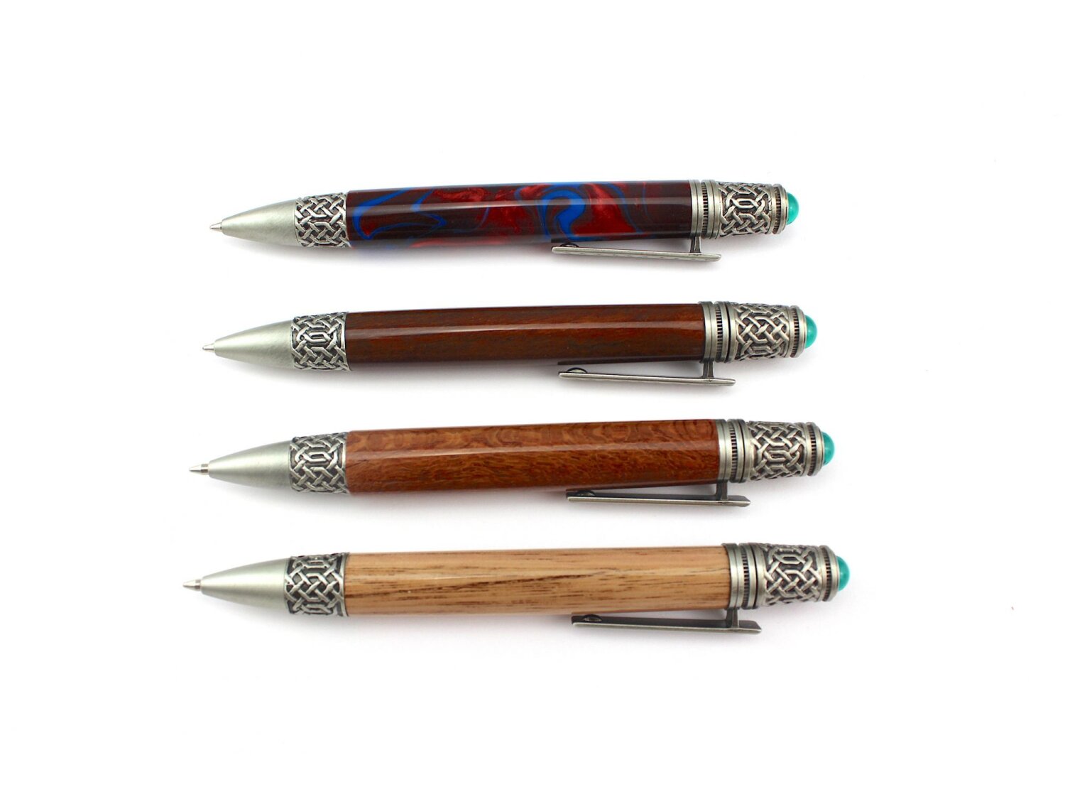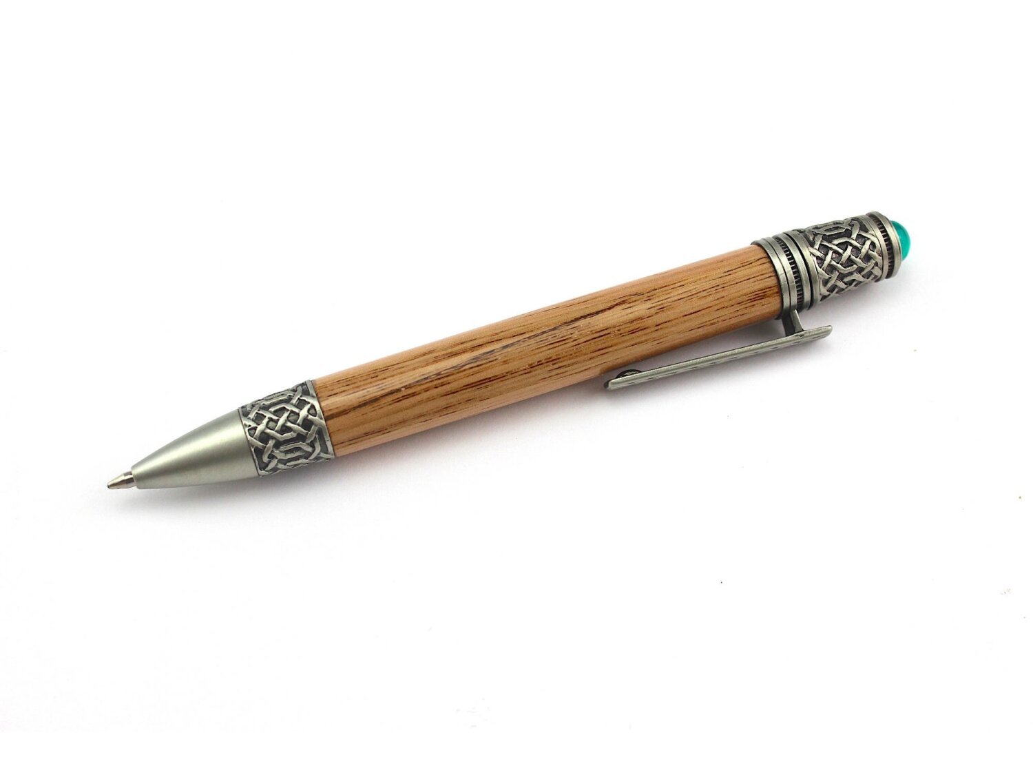 The Celtic pen features intricate celtic knot scrollwork on the tip, clip and end and a deep green emerald coloured cabochon that flashes in the light. The authentic patinas and natural darkening of the metals brings out the celtic knot details beautifully.