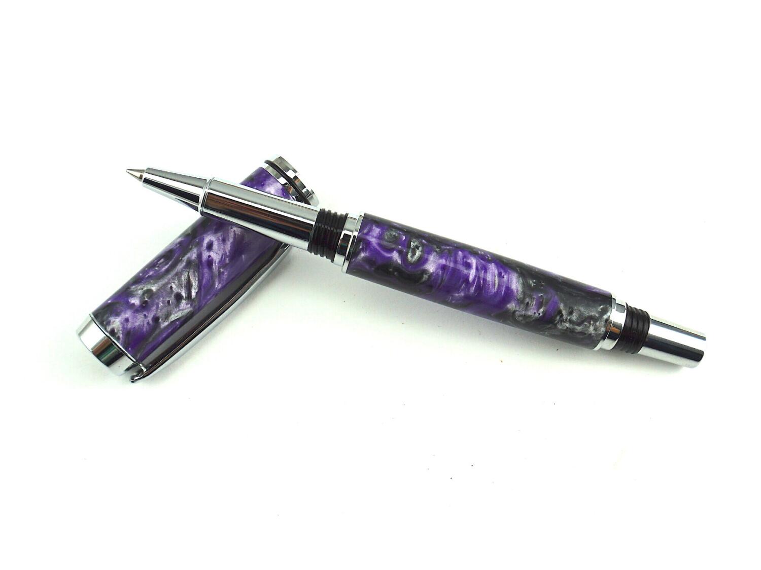 This soulful lavender resin has shades of purples with charcoal grey and with pearlescent white swirls. It has the mystique of a mauve iris at twilight. This hand cast pen blank is made by an Australian resin artisan.