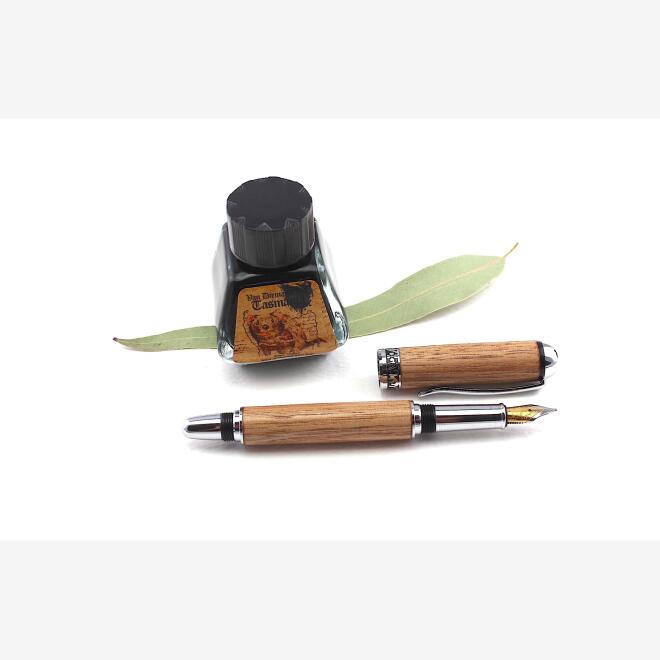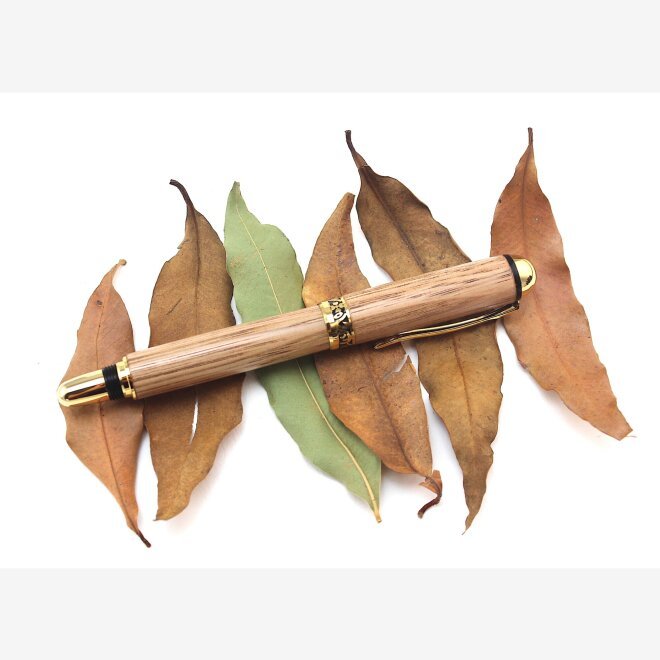 This pen features Tasmanian oak timber. Tasmanian oak refers to three eucalypt species commonly found in Tasmania, as well as alpine regions in Victoria and NSW. Tassie oak trees grow up to 90 metres in height. Tasmanian oak is generally a warm, light toned Australian hardwood timber with a dense, even grain.