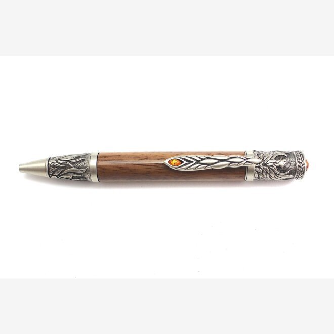 The phoenix firebird is captured superbly. Flames are embossed at the tip of the pen, the phoenix is shown rising from the ashes with wings outspread, with the clip depicting the majestic tail. An amber crystal on the clip and cap add to the beauty and majesty of the firebird. $1 from the sale of this pen goes towards planting trees to reforest Australia with Reforest Now. Plus at checkout you can plant one tree and receive a tree planting certificate.