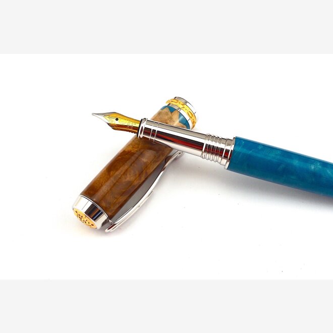 The Boss pen is a statement piece. This luxury pen has the strength of rhodium combined with hand cast 22k gold accents and takes the warm charisma of resin to create an inspired writing experience. It is a pen of distinction.