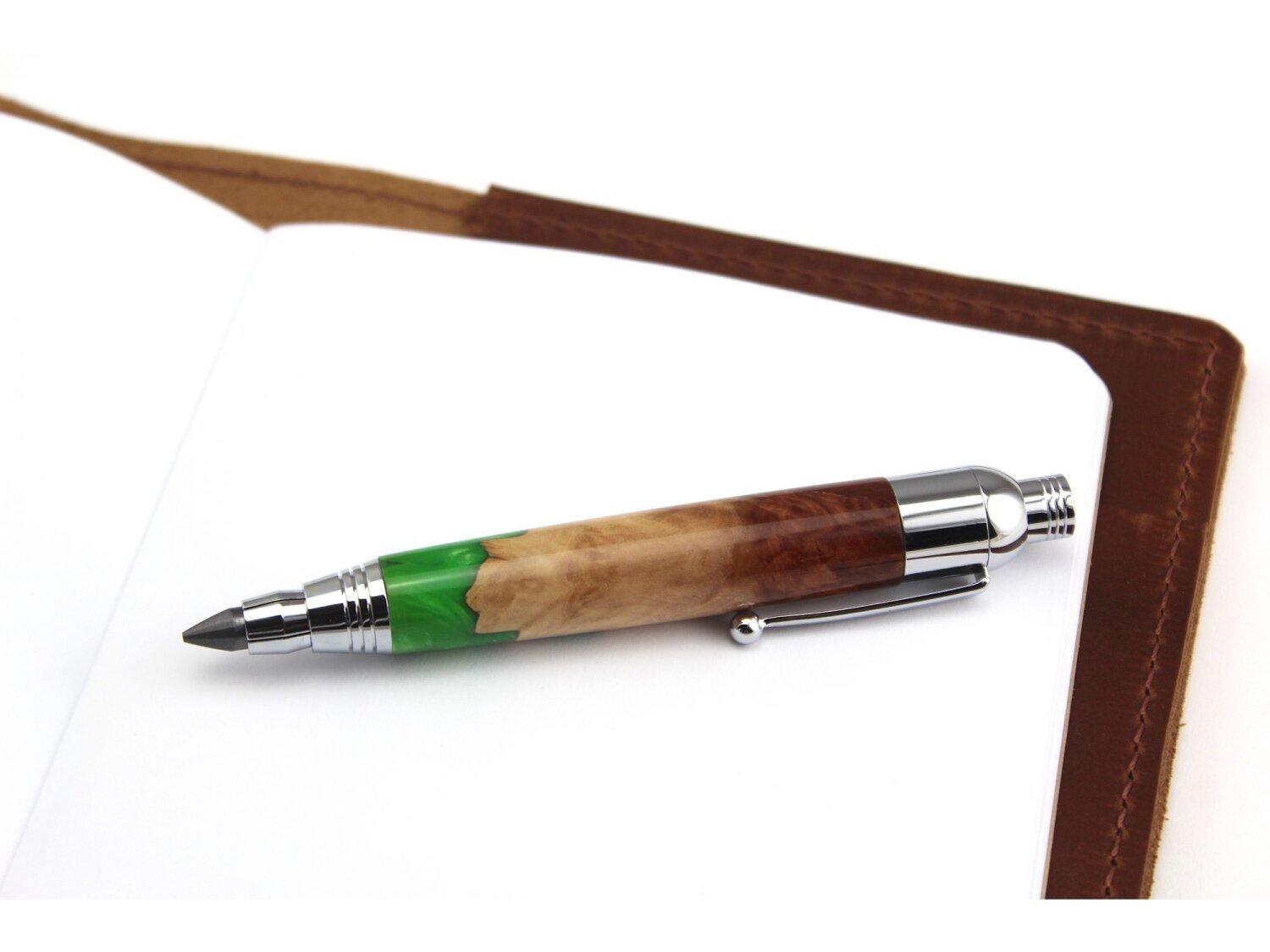 This artisan resin is named Norfolk Green after Norfolk Island's evergreen palm trees. The majestic palms overlook pristine seas and offer the eyes a relaxing vista. Green is a vibrant yet refreshing colour. This pen is created from an Australian timber burl plus hand poured brilliant green resin, featuring swirls of green and pearlescent shimmer. It is hand-poured by an Australian resin artisan.